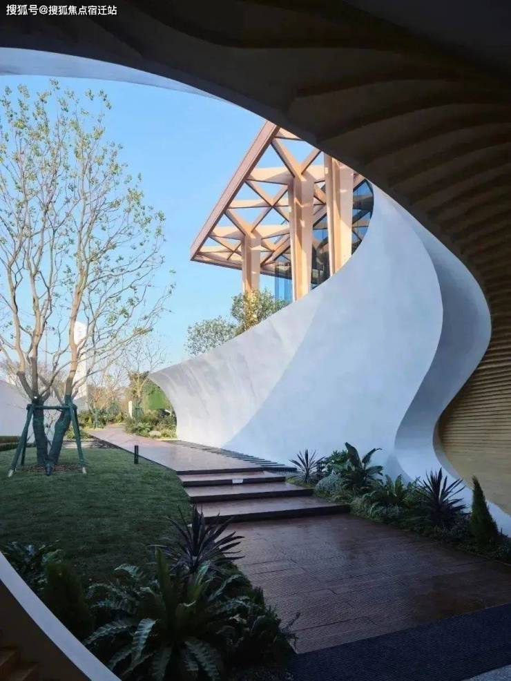 建筑一角从白色的弧墙上交杂着自然景观探头而出,展现出建筑独特的语言符号。