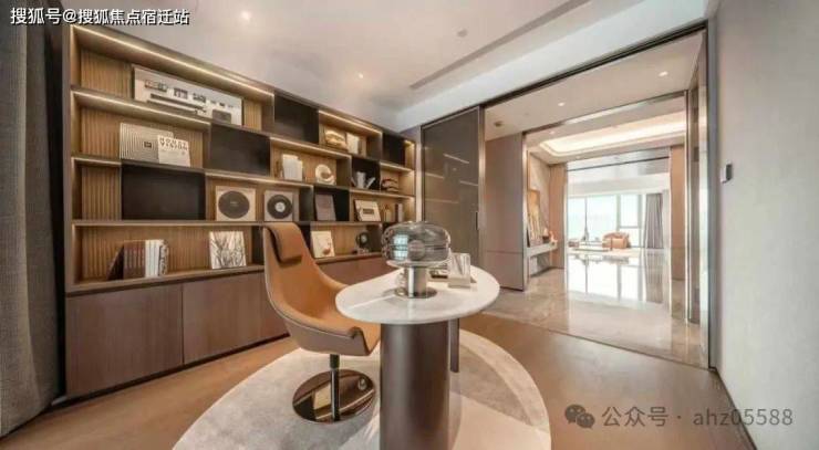 通铺的爱马仕灰石材质感高级、约5.1米的白金沙石材的客厅背景墙更是大气、范思哲黑的石材基座,天然黑胡桃的木饰面,也与其完美的融为一体。就连吊顶,也采用的是造价更高的圆弧形设计。