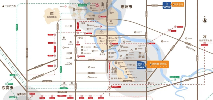 【项目交通】金山湖是连接珠三角与大湾区的重要枢纽节点,占据城市交通要道,位于金山城芯的信利康乐创汇,交汇四环南路与惠大高速,陆空轨多维立体交通环绕,高效串联核心资源。