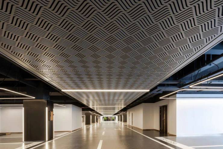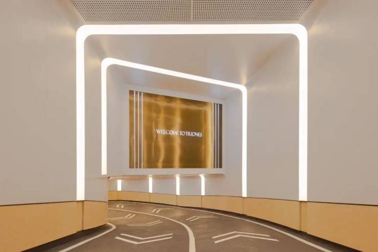 门厅一路之隔为地下车库入口,两侧的贝特白石材与门厅的立柱形成材质呼应。金摩卡石材墙面内嵌软膜灯槽形成节奏感持续向前,坡道地面精选防滑地坪漆刷就。车库内部,顶面大体量雕刻装饰铝板、金色铝板立柱扑面而来,于繁复的意向中不断强化豪宅区的氛围感。