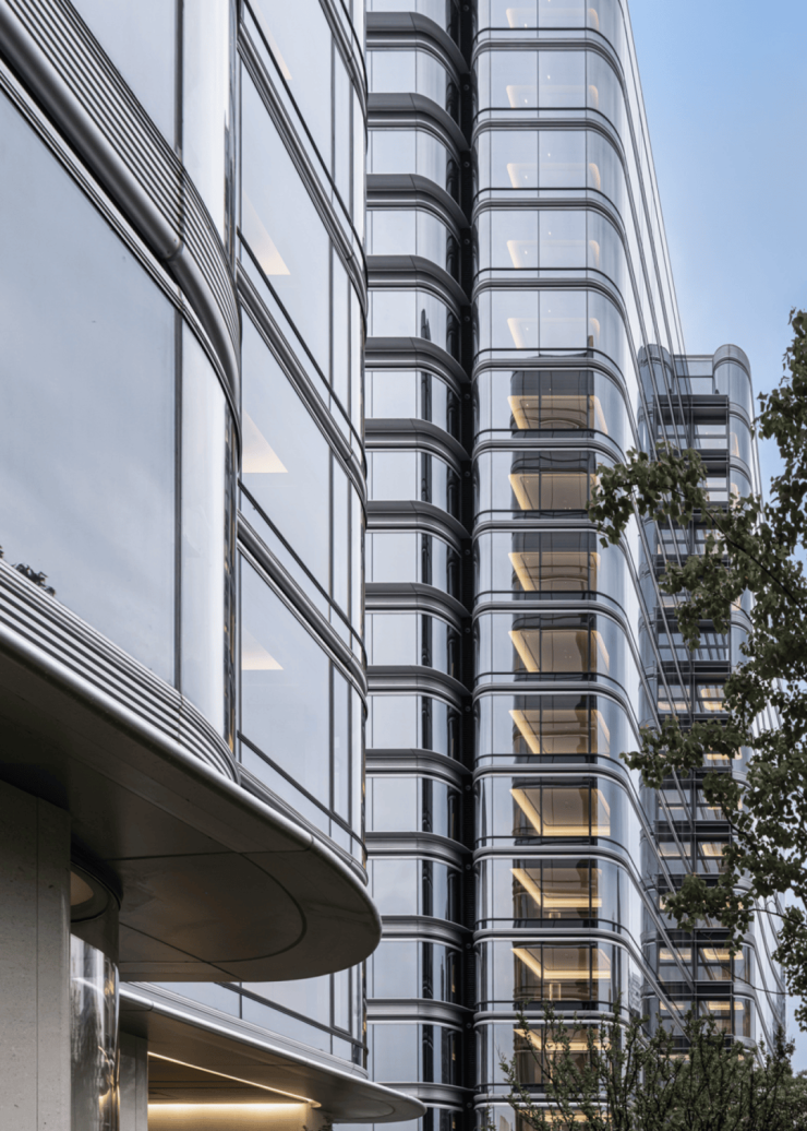 项目位于钱江新城,江与河的交汇口。通过对场地的分析,为了极致利用城市景观并提升楼栋经济价值与体验价值,我们采用 “外借内造” 的策略,将楼栋贴合场地边界布局,形成最大中心花园;并通过圆润的弧线形式过度转角,作为最佳观景视角因而获得更通畅、连续的 “广角” 观景体验。
