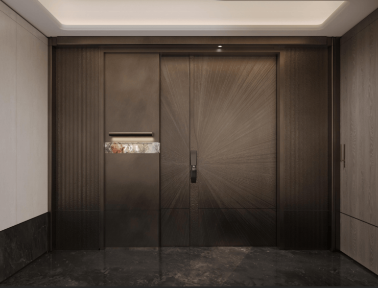比如入户大门配备大面积的金属格栅、局部莫奈奢石。