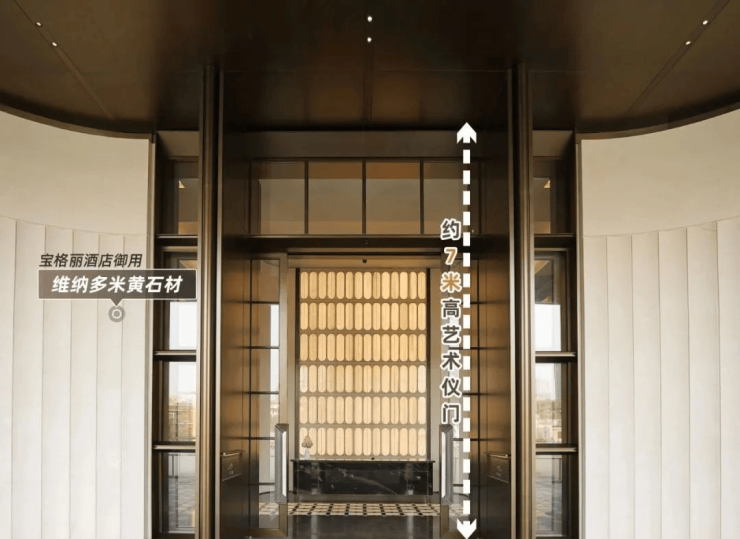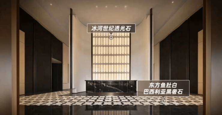 一进大门,整个入户大堂以宝格丽酒店设计风格为灵感,每一个细节都透出映射质感,约7米高的艺术移门辅以奢石弧形墙面,以强烈的仪式感,勾勒通往越秀·万博和臻的“玄关”。