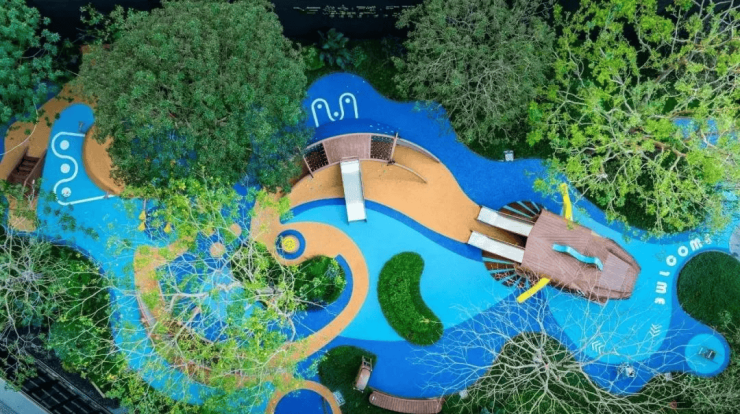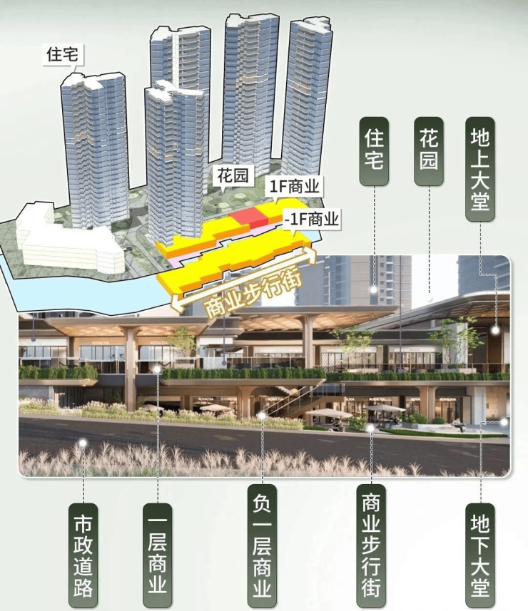 社区内规划了116万平的商业配套,涵盖办公楼、购物中心、酒店等地,不过这个需要时间等待,目前一期的立体商业街已经开放了实景,和其他社区的商业不一样,这里的商业街十分注重关系的处理: