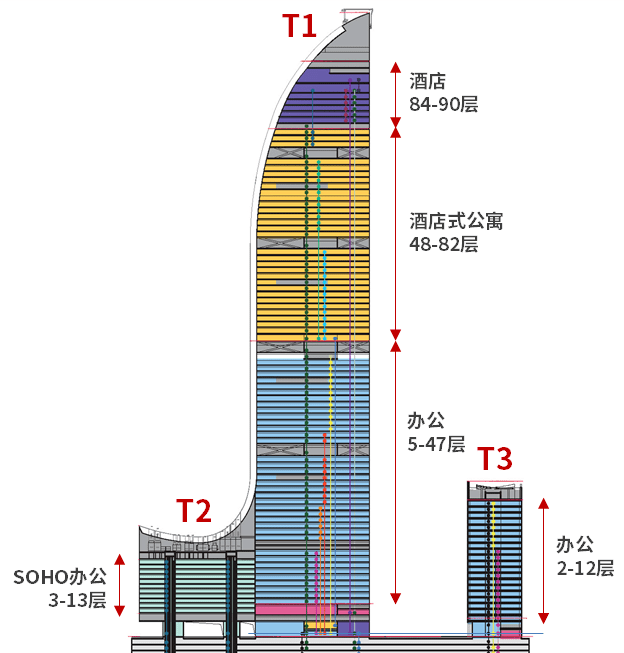 消防登高场地位于T1塔楼东侧及南侧、T2塔楼南侧及T3塔楼北侧。消防车道利用基地内车行道路,沿各幢塔楼分别环通。消防车道流线清晰,为本项目的消防安全提供有力保障。项目于L83增设避难层, L84-L90人员可从疏散楼梯到达L83避难层,利用10m/s高速穿梭电梯将人员疏散到首层仅需48秒。如突发火灾顶部酒店人员可通过穿梭电梯安全疏散。T1主塔楼 5~47层设为可租售办公,平面上户型分隔灵活,高度上按不同楼层分为四个区段,各区在首层有独立电梯厅,可高效使用。