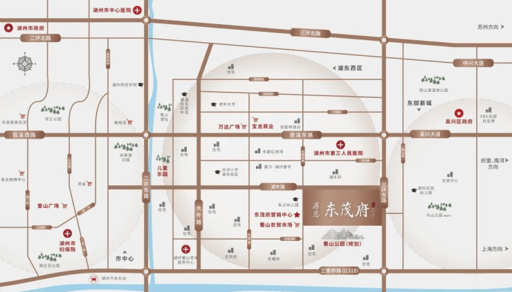 【多维交通】紧邻三环东路、G318沪聂线,向北即达内环快速路、沪渝高速等,同时湖州互通、沪苏湖高铁湖州东站(在建)组成全域进出的交通枢纽,共同打造湖州一小时经济都会圈,纵享极速出行