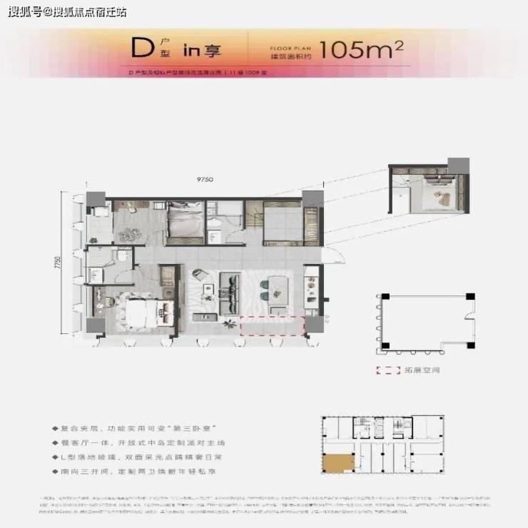 复合夹层,功能实用可变“第三卧室”;餐客厅一体设计,开放式中岛可成为派对主场;南向三开间规制,窗外即是“都会绿洲”。