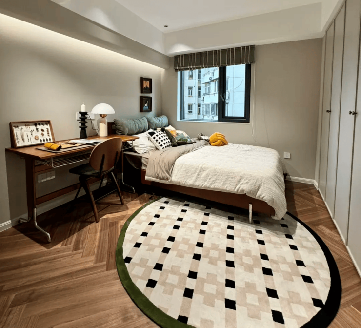 宽敞明亮的客厅:无主灯吊顶结合白色家具,上下呼应。深色背景墙注入摩登氛围,独特造型的吊灯彰显个性,窗边橙色休闲椅曲线流畅舒适,棕色木质背景墙与线条点缀体现精致生活态度