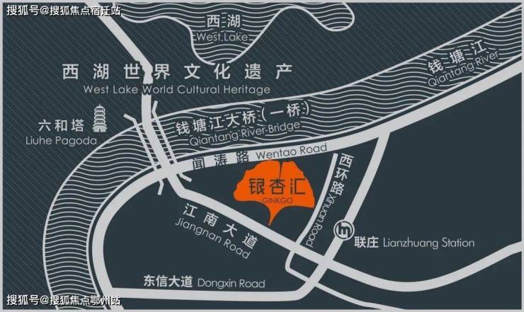 银杏汇公寓紧邻一桥,位于钱塘江入海前壮美的一段,与六和塔、九溪、西湖风景区隔江相望,人文浓郁,是唯一同时拥有“山、水、塔、桥、城”五大景观的区块,与九溪之江别墅区和钱江新城豪宅区构成豪宅三角区。