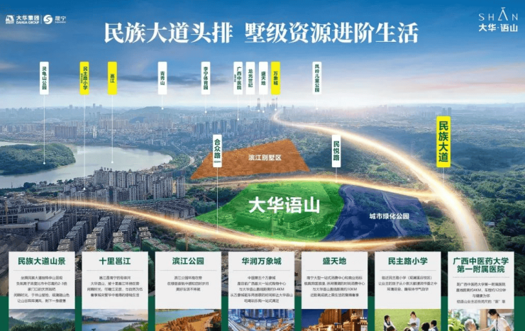 大华语山所在青秀东滨江低密板块,民族大道东头排,仅一个红绿灯,约15分钟直达东商区,万象城、盛天地、航洋、山姆会员店等城市最优质配套近在咫尺。