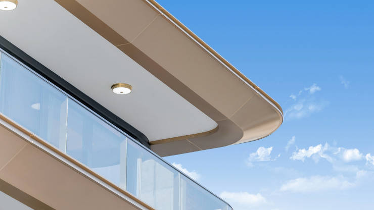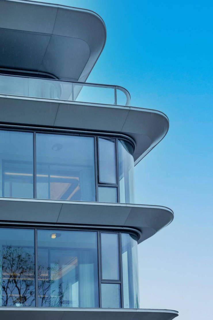 定制皓月银铝板搭配大面幅落地玻璃,高级艺术白调融合精致气韵,赋予建筑以优雅、内敛的品质感与艺术之美。