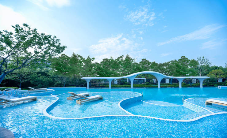 汲取新加坡“圣淘沙”泳池灵感,将建筑极简、纯粹的元素融入泳池设计之中,巨资打造约870㎡无边际叠水泳池,景观水面层层叠水,曲水律动与花园景致融为一体,玻璃围墙呈现无边际泳池般的通透感,营造出宁静自然的高端酒店式度假氛围。