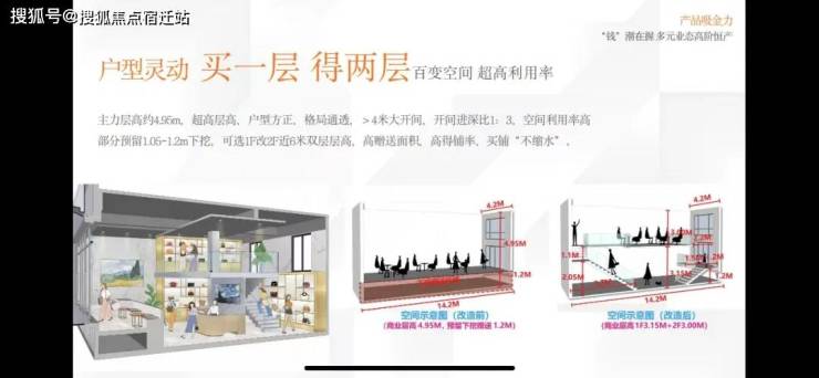 【商铺层高】3.2-4.95米,部分可下挖1.05-1.2米(层高6.15米可做两层)