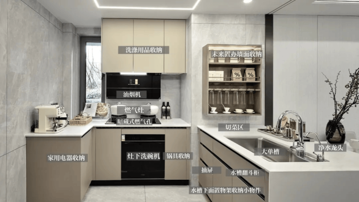 双面加宽组合型岛台,岛台长度从传统的60mm拓展至90mm,拓展操作空间;其他像预留双开门冰箱位、灶台背面大板砖、顶面线性灯+凉霸等人性化品质细节,也都是交付标准!