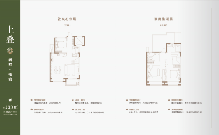 叠墅产品分为4F、6F层叠加, 主力产品建面约约122-133㎡上叠,132㎡大平层,131-145㎡下叠。