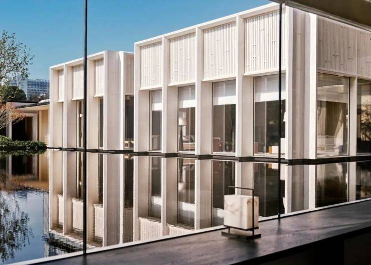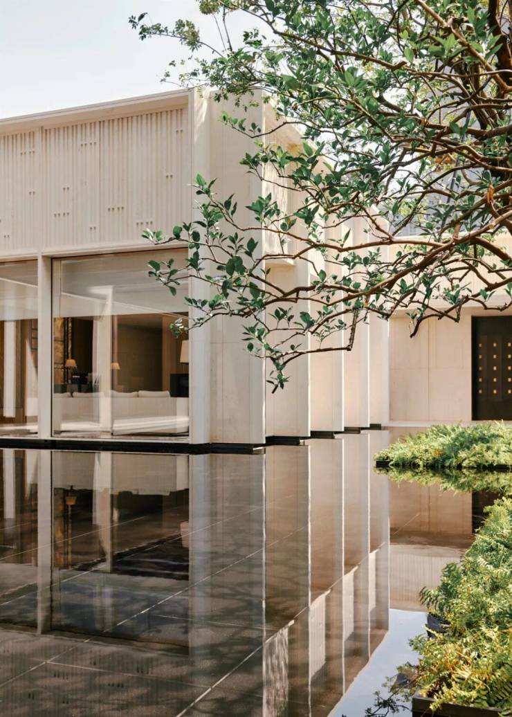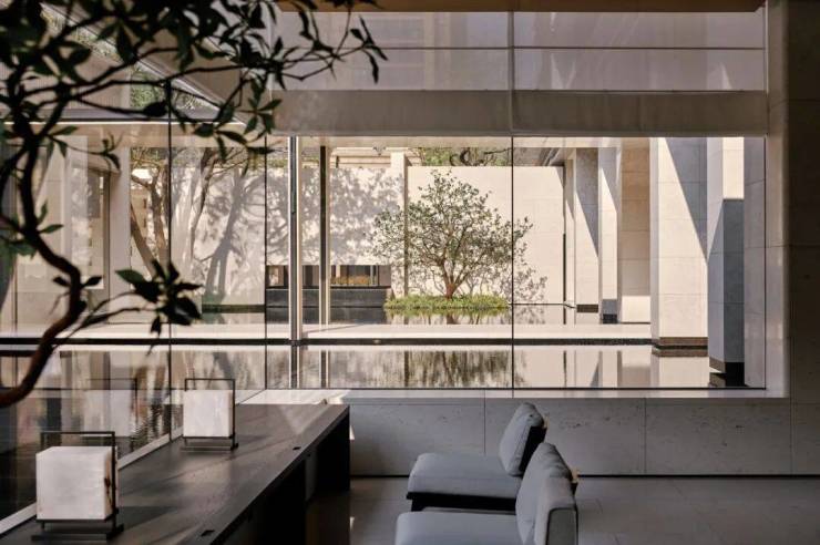 建筑、回廊、树丛仿佛都漂浮水上,叫人想起那句“美人在骨不在皮”的俗语,无需花哨粉饰,只以大尺度空间、平铺水院、大幅玻璃为画布,由得自然光信笔创作,这才是骨子里的性感。