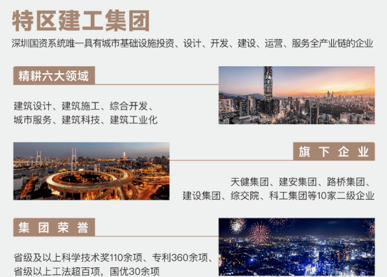 特区建工集团,“建设城市、服务城市”生力军,城市现代化建设与服务的主力军、城市应急抢险的中坚力量,建筑行业高质量发展的先行者、建筑产业链综合服务商。业务涵盖建筑设计、建筑施工、建筑工业化、城市服务、综合开发、建筑科技。