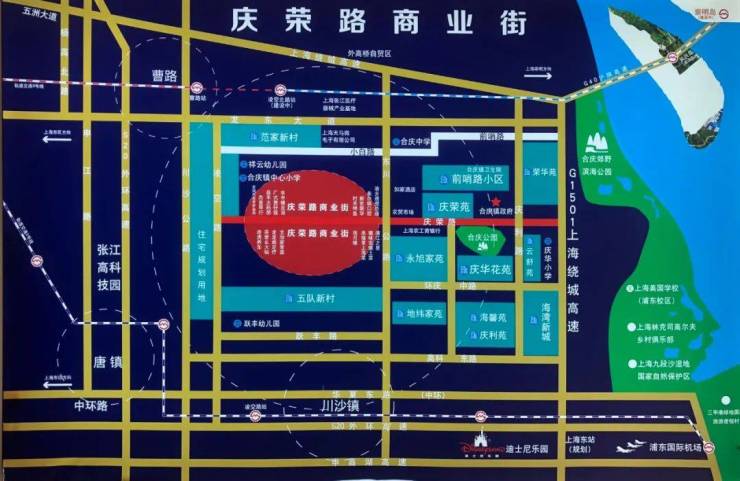 庆荣路商业街项目位于合庆镇的镇中心,南侧是浦东国际机场,未来还有上海东站,合庆镇的西侧则是张江高科技园区。依托浦东新区强大的产业能力,合庆镇其实已经定位成为了浦东新区的“后花园”,南边迪士尼,东边观光海岸线,未来的合庆镇,商业繁荣,旅游业兴旺。