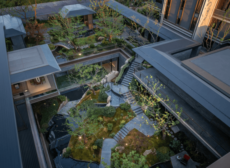 再往里走就是近460㎡的下沉式庭院,精选太行山金景石堆叠成小山丘,引进溪水汇聚成池塘,并移栽岭南珍贵的古桩铁冬青和中华原生乌桕树,形成一幅立体山水画卷。