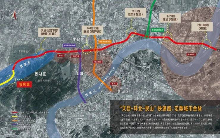 天目-环北-艮山快速路改造工程将与地跌 3 号线同步建设,快速路总长近 40 公里,由 西向东串起了留下、武林、城东新城、钱江新城 2.0、钱塘新区,是 杭州“四纵五横”快 速路网最重要的“一横”。全线贯通后,从绕城西驱车前往大江东,全程几乎没有红绿 灯,畅通情况下只需45车程。项目出发10左右到达武林商圈。