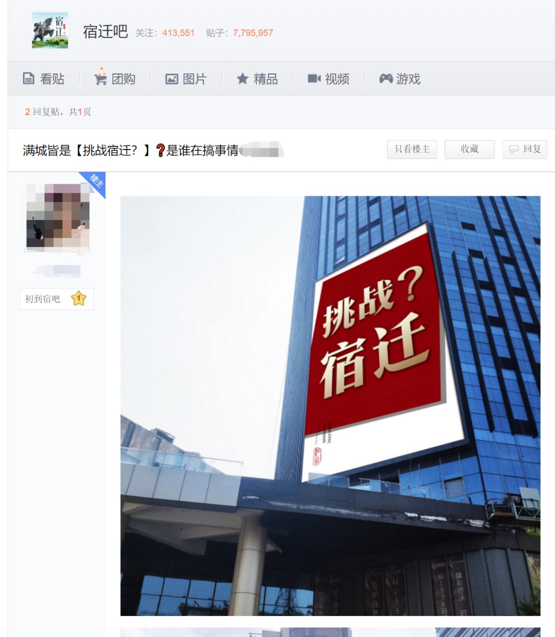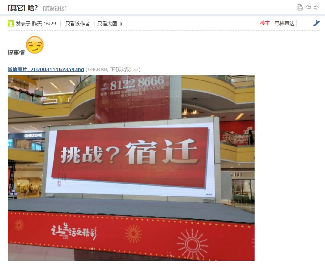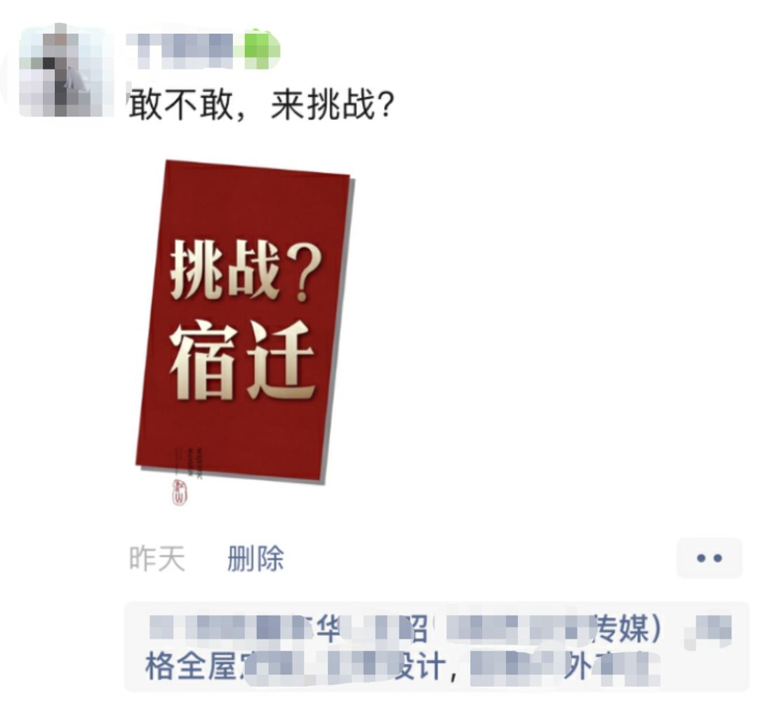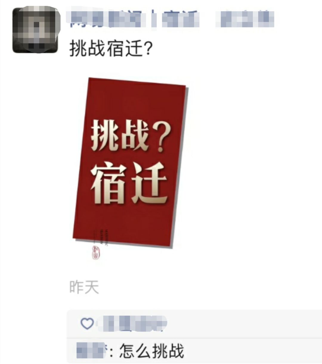 /挑战宿迁/ 什么情况? 昨天在宿迁随处可见这张海报 刷爆了整个宿迁 很多人一头雾水 这到底是什么鬼? 挑战宿迁?! 小编的疑问是,这句话说半截子 乍一看“挑战宿迁?!” 这个命题还怪吓人的 挑战宿迁什么?谁来挑战?怎么挑战? 于是特意寻找这张图片各个出处 不找不知道,一找吓一跳 1、整个宿迁已刷爆