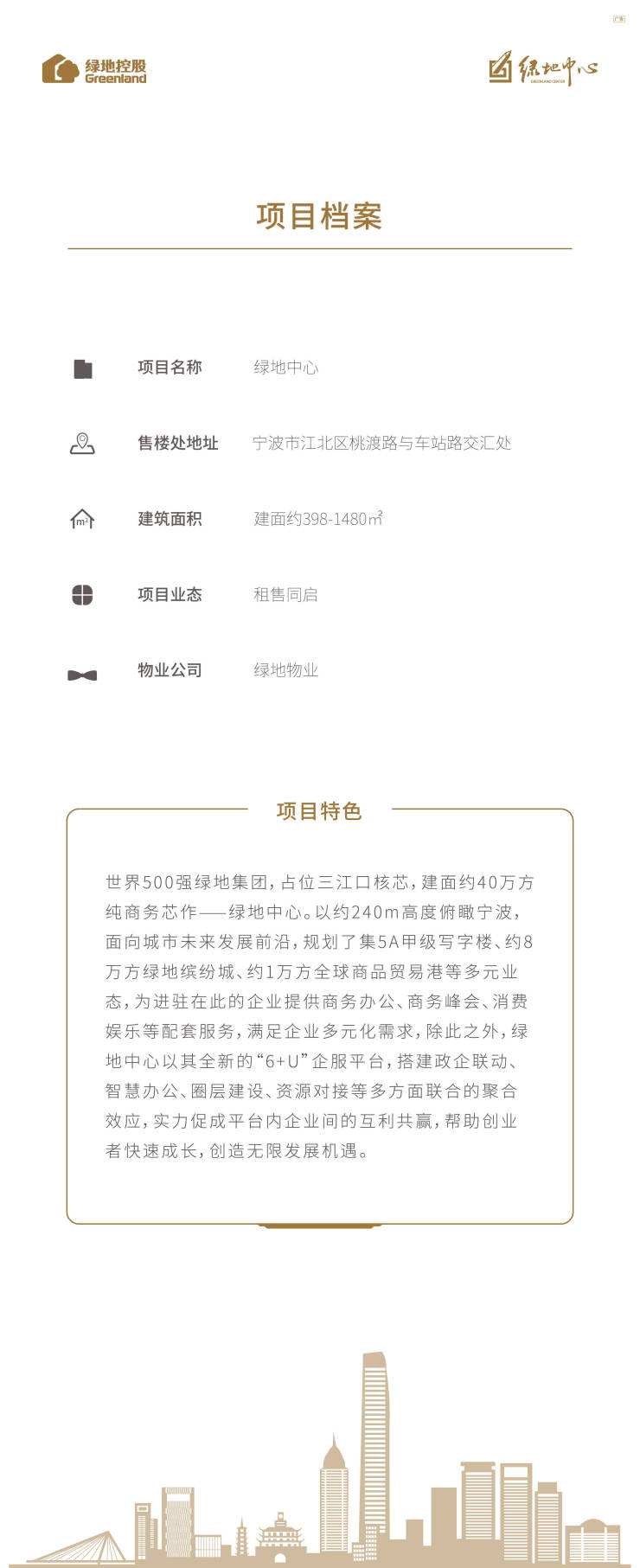 绿地携手日本设计株式会社、AECOM景观设计、UA国际等世界著名建筑团队,匠心规划——建面约40万方集甲级写字楼、品牌商业于一体商务综合体,同时引入全新的高端商业品牌——绿地大馆,建面约8万方国际商业集群,成为宁波时尚商业主场。