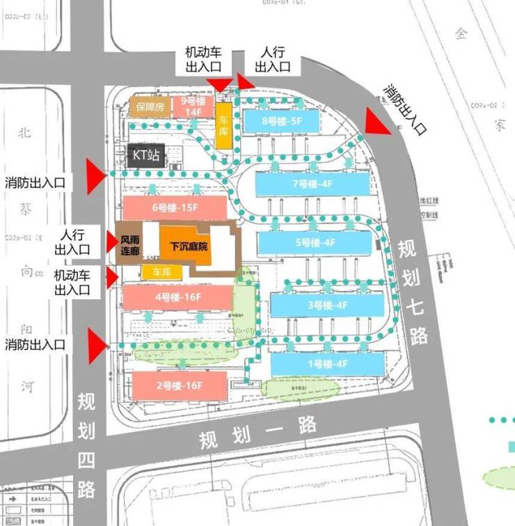 多个消防出入口的合理布局,有效减少了因消防回车场地设置而造成的硬地面积过多问题,最大限度地增加了绿化面积。