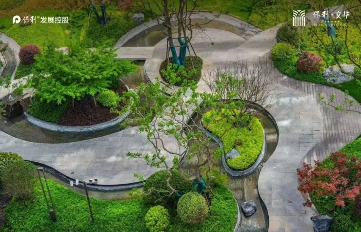 林荫空间,潺潺流动的叠水成主角,与精心栽种的植物相映成趣;旱溪小桥花境,小溪曲折蜿蜒,水底瓦片堆叠。近距离观察,朴树、榉树、红枫等禅意十足,投射出静谧浓荫。