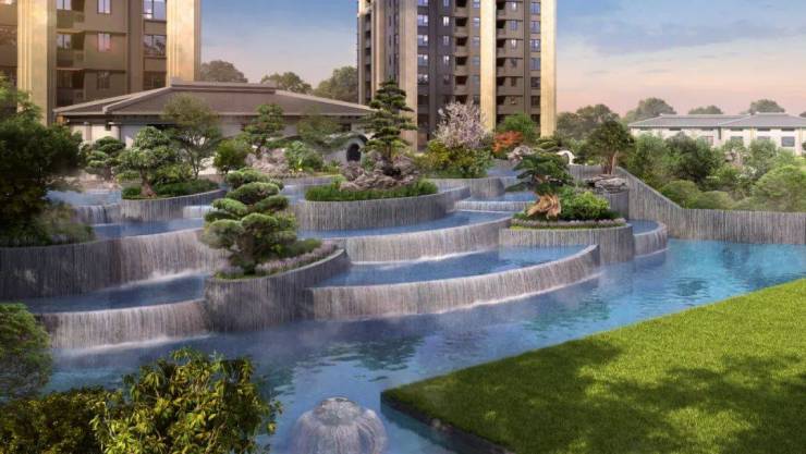 社区内部植被丰富,设置众多艺术雕塑、景观休闲步道、中央景观层叠式水瀑布、儿童游乐场等