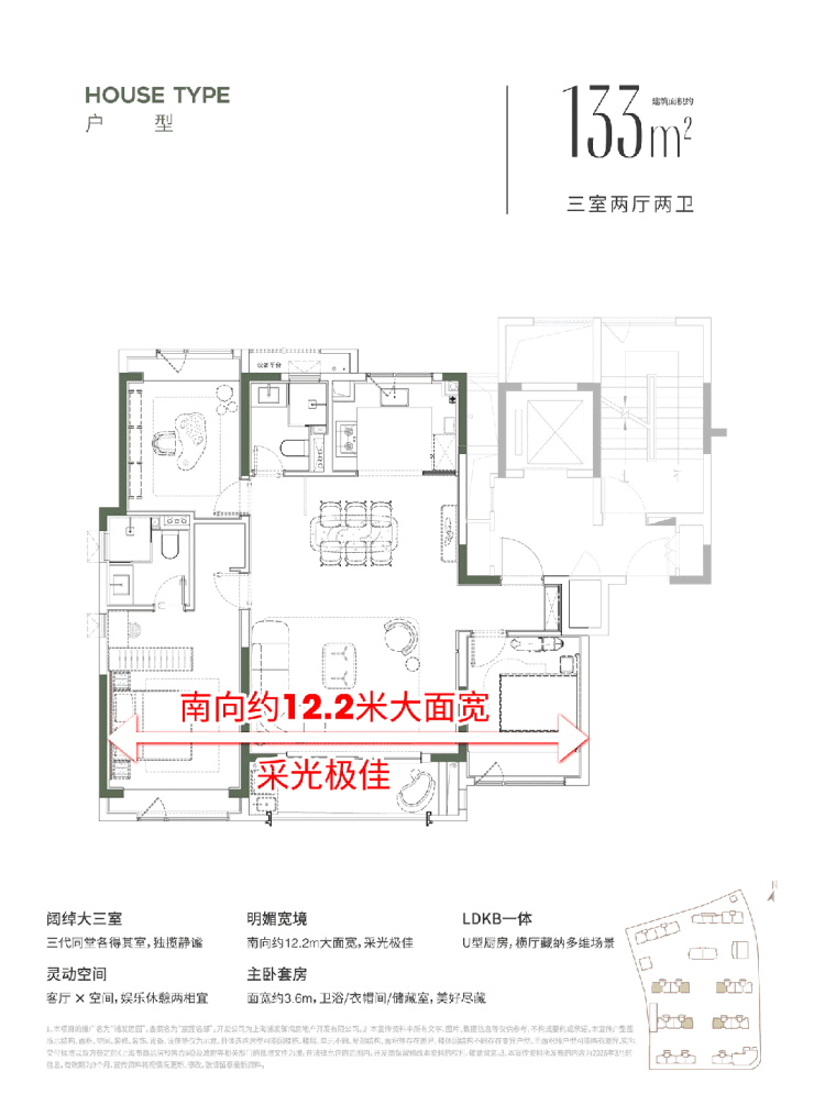 约 133㎡大三房:飞机户型,客餐厅净面积约 39㎡,客厅面宽约 5.5 米,主卧面宽约 3.6 米,尺度舒适