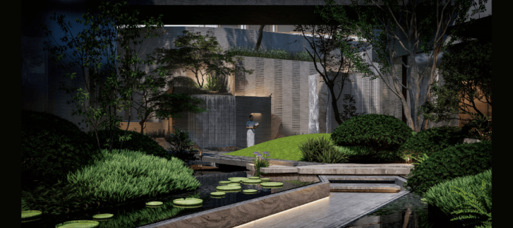 中央水韵庭院以「叠水莲池」为理念打造多层次的水景体系,叠水瀑布形成动态的水流韵律,池畔大理石打造的休憩长桌,成为被绿意环抱的林下空间,氛围相当惬意~