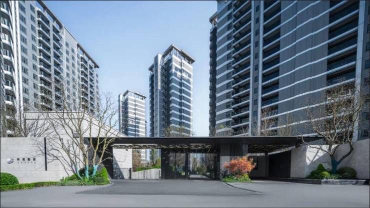 走到项目的第一步就看到气派庄严的大门,门头采用高级的星空灰和深色铝板,顶部设计铝板格珊,两侧种植超60年树龄的乌桕,形成一个简洁,识别性强的社区入口形象,为业主带来流畅和谐的归家体验。