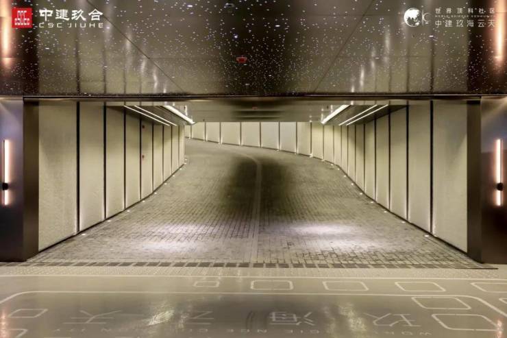 中建玖海云天是临港首个精装修地库的社区,仲公子来到地下车库的入口,首先映入眼帘的是坡道上方“世界顶科社区玖海云天”的logo文字,归家仪式感拉满。