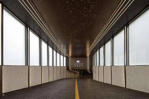 坡道地面采用独特防滑马蹄石坡道铺设,极大地增强了地面耐磨性和行驶摩擦力。两侧墙面采用星云石再搭配竖向装饰灯条,配备苍穹星空顶星光熠熠。