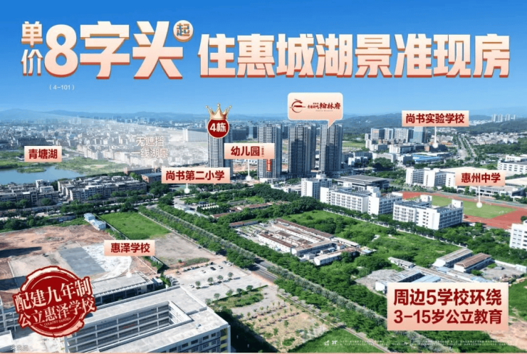 5学府环伺,翰墨飘香:小区自带幼儿园,配建54班惠泽学校(公立小学、初中),两侧尚书第二小学、尚书实验学校(私立小学、初中),对面惠州中学,项目北面还规划一所九年制学校(具体教育资源分配以政府公布为准,开发商不做承诺)