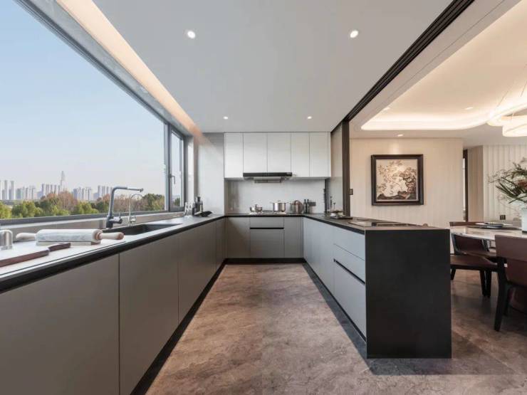 客厅开间约6米,餐客厨采用LDKB一体相连的设计,面积约72㎡。尤其是厨房宽面基本与客厅持平,这才是豪宅该有的厨房。