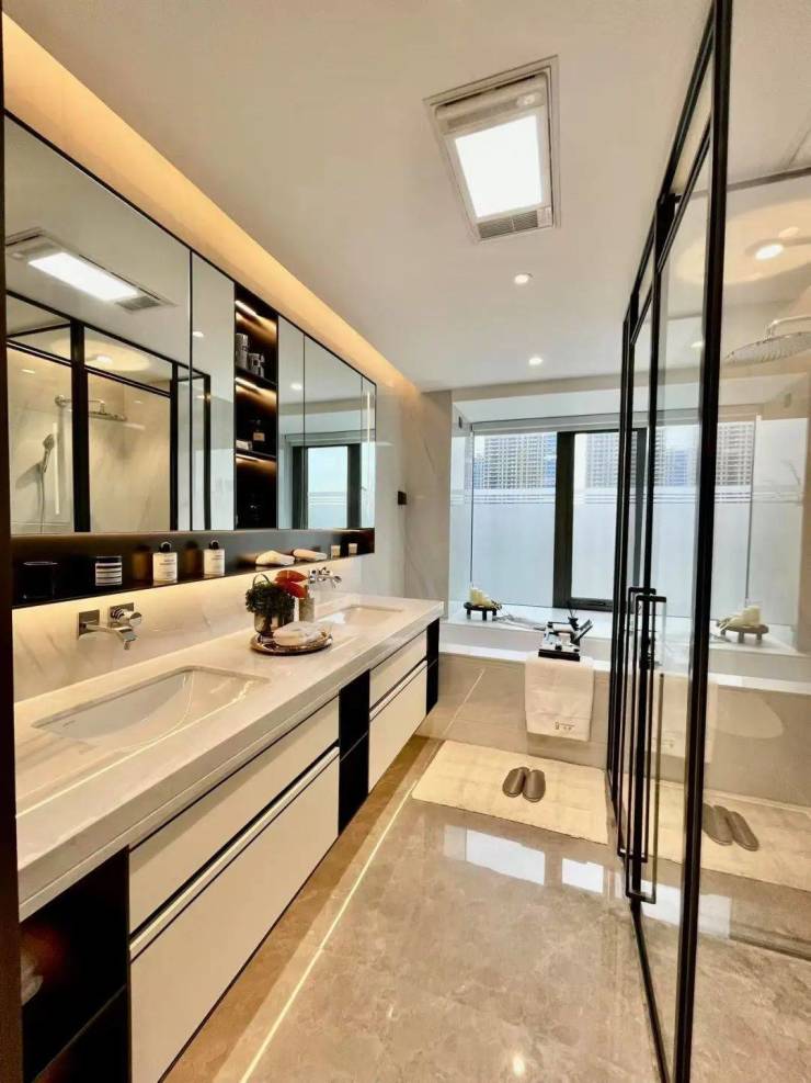 180、230㎡户型的主卧布局几乎一摸一样,双台盆+浴缸+淋浴隔断+马桶隔断,还有北向大落地窗,很不错,粗很喜欢!