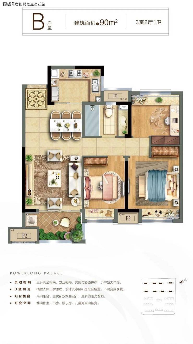 B户型:建面约90㎡,3室2厅1卫,户型与105㎡基本一致,虽然只是少了主卧的配套厕所,但阳台也小了很多,如果介意阳台小的还是选105㎡比较好。
