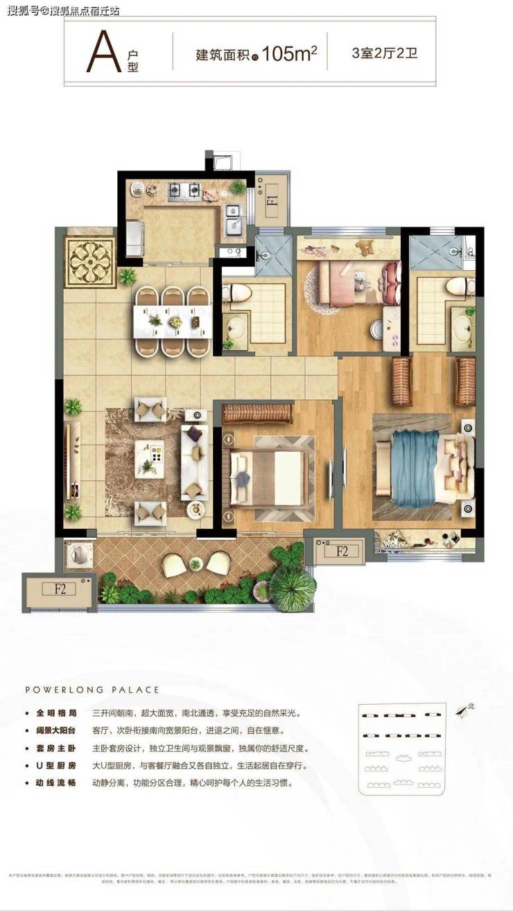 A户型:建面约105㎡,3室2厅2卫,三开间朝南,非常方正的户型,承重墙的位置设计的没有很突兀,毛坯房业主可以重新改造。