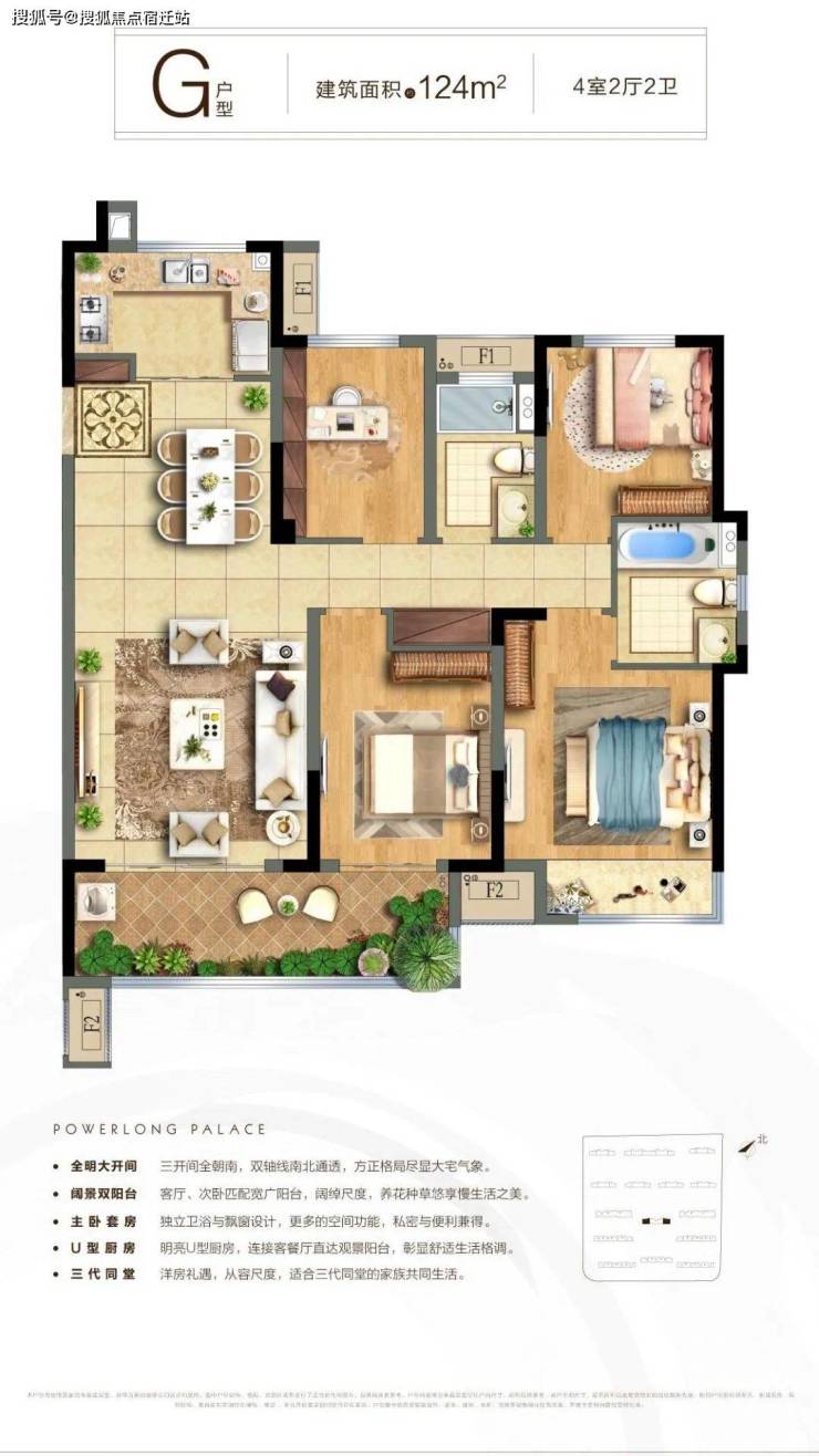 G户型:建面约124㎡,4室2厅2卫,户型方正,南北通风,对于三代同堂的家庭,还是蛮不错的选择。
