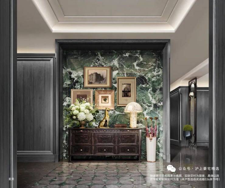 建筑面积约495㎡传家大宅,海派气质内外辉映;深色木饰面与柔和的刺绣主背景,框定空间层次格局,营造稳当厚重的氛围基调,法式留白的墙面与顶部造型,与原筑提取的典型拼花地砖相呼应,经典的精致与典雅,海派传家大宅的气度不言而明。