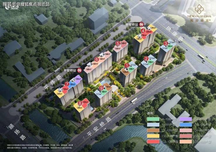 面积约108、111㎡2梯3户的3房2卫户型,139㎡(2梯2户、2梯3户)的4房2卫户型,168㎡(2梯2户)的4房3卫户型;